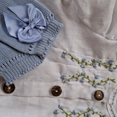 New in for summer: an A-line dress with front pleats, and bonnet in 100% white linen.