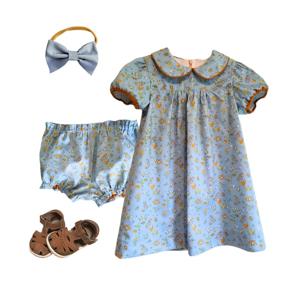 The Karine Dress and Bloomers set in Liberty Lasenby Cotton is a well-made, sturdy set for your baby or toddler. Sizes larger than 2 years do not include the bloomers.